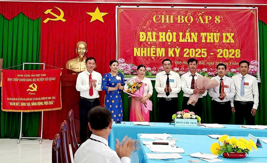 Ảnh: Đồng chí Huỳnh Văn Sơn (thứ 4 từ phải qua) – Bí thư Đảng ủy xã Vĩnh Hòa Hưng Bắc tặng hoa chúc mừng Chi ủy Chi bộ nhiệm kỳ mới và đoàn đại biểu dự Đại hội cấp trên của Chi bộ ấp 8 tại Đại hội Chi bộ lần thứ IX, nhiệm kỳ 2025-2028 – đây là Chi bộ được Đảng ủy xã chọn làm điểm tổ chức Đại hội Chi bộ trực thuộc nhiệm kỳ 2025 - 2028.