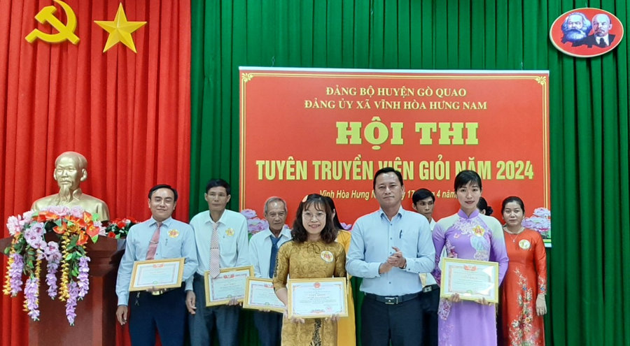 Kết quả Ban tổ trao 02 giải A cho tuyên truyền viên Dương Thị Bích Huyền – Bí thư xã Đoàn và Nguyễn Ngọc Xoàn – Phó Bí thư chi bộ ấp Vĩnh Hòa 4; trao 03 giải B cho tuyên truyền viên: Phan Thị Trúc Linh – Phó Bí thư chi bộ trường Tiểu học 1, Kim Song Đảng – Phó Chủ tịch Hội liên hiệp phụ nữ xã và Lê Chí Trường – Phó Bí thư chi bộ ấp 3; trao 04 giải C cho các Tuyên truyền viên: Lê Văn Rỏ - Bí thư chi bộ ấp Vĩnh Hòa 1, Lâm Trung Kiên – Chủ tịch Hội Cựu chiến binh xã, Lê Mỹ Liền – Chủ tịch Hội nông dân xã, Nguyễn Xuân Hoàng – Bí thư chi bộ ấp 2./.