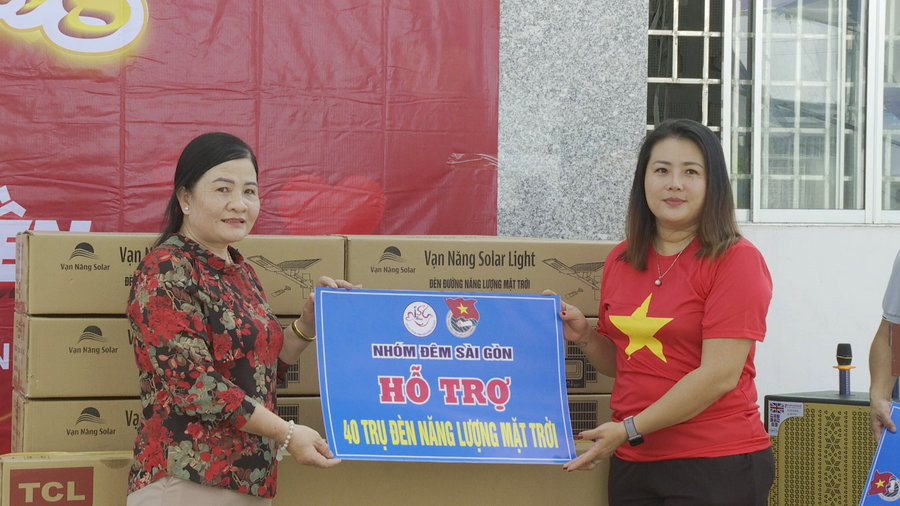 Ảnh: Đại diện đơn vị tài trợ trao bảng tượng trưng 40 trụ đèn năng lượng mặt trời cho xã Thủy Liễu.