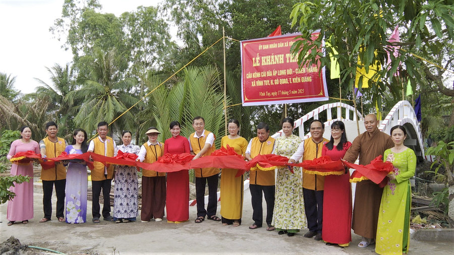 Ảnh: Đại diện chính quyền địa phương cùng đơn vị tài trợ cắt băng khánh thành đưa vào sử dụng cầu giao thông kênh Cái Đĩa, xã Vĩnh Tuy.