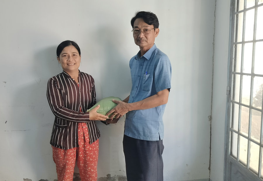 Ảnh: Ông Quảng Trọng Dũng (bên phải) - Chủ tịch Ủy ban Mặt trận Tổ quốc Việt Nam, Tổ trưởng Tổ vận động “Hủ gạo dự trữ vì người nghèo” xã Định An trao gạo hỗ trợ cho chị Cao Ngọc Yến – một hoàn cảnh khó khăn ngụ ấp An Trung, xã Định An.